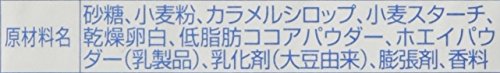 原材料:砂糖、小麦粉、カラメルシロップ、小麦スターチ、乾燥卵白、低脂肪ココアパウダー、ホエイパウダー(乳製品)、乳化剤(大豆由来)、膨張剤、香料