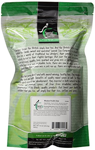 -. Binding : Grocery -. Brand : Special Tea -. EAN : 0852667690434 -. Feature : Loose Leaf Tea / Makes approximately 200 cups of tea / Each packet is hand packed in the USA. / Premium tea leaves have all their essential oils intact, so the flavor, quality and health benefits are maintained. -. Label : Special Tea -. Manufacturer : Special Tea -. NumberOfItems : 1 -. PackageQuantity : 1 -. ProductGroup : Grocery -. ProductTypeName : GROCERY -. PublicationDate : 2014-06-29 -. Publisher : Special Tea -. ReleaseDate : 2014-06-29 -. Size : 16 Ounce -. Studio : Special Tea -. Title : Special Tea Wisdom Pu-erh Chai Tea, 16 Ounce -. UPC : 852667690434