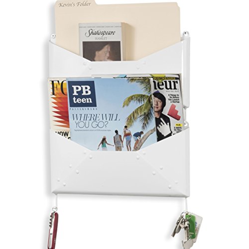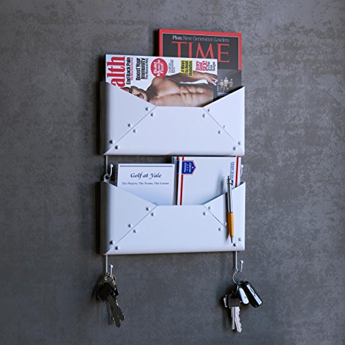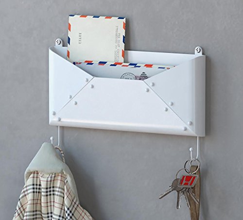 Buroh Wall Mount Foyer Mail Holder Key Hooks Newspaper Magazine Storage Coat Rack Envelope Shape Entryway Organizer with Key Rings Hooks Steel White Set of 2