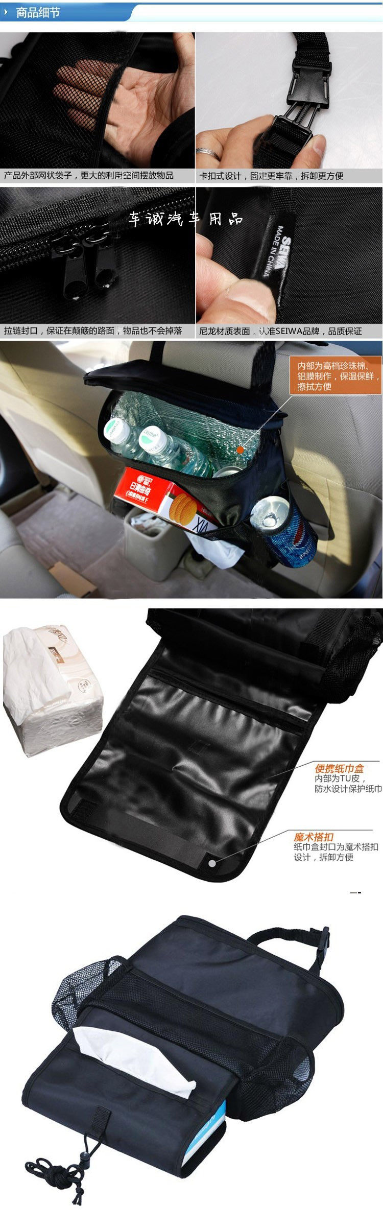 1, the biggest feature of this product is the capacity of a large, fixed rear seat back, you can store magazines, CD and tissue boxes.