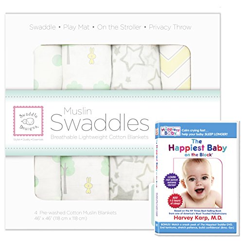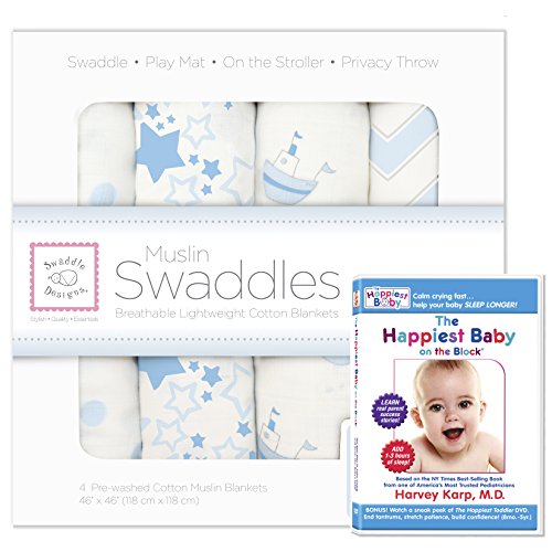 Learn how to soothe your baby in mere minutes, with Dr. Karp's renowned expert advice on the 5 S's: Swaddling, Side, Swinging, Shushing, and Sucking; and our award winning swaddling blankets. Each blanket comes with our signature 123 Swaddle label with easy how-to-swaddle steps sewn to the edge of the blanket. And our 100% premium cotton muslins with cheerful designs and comforting colors get softer with every wash. Beyond swaddling, use as a nursing cover, sunshield on the stroller, playmat for tummy time, and more. Machine wash gentle. Bundle includes: set of (4) Muslin Swaddle Blankets packaged in a box and (1) Dr. Karp's The Happiest Baby on the Block DVD.Feature