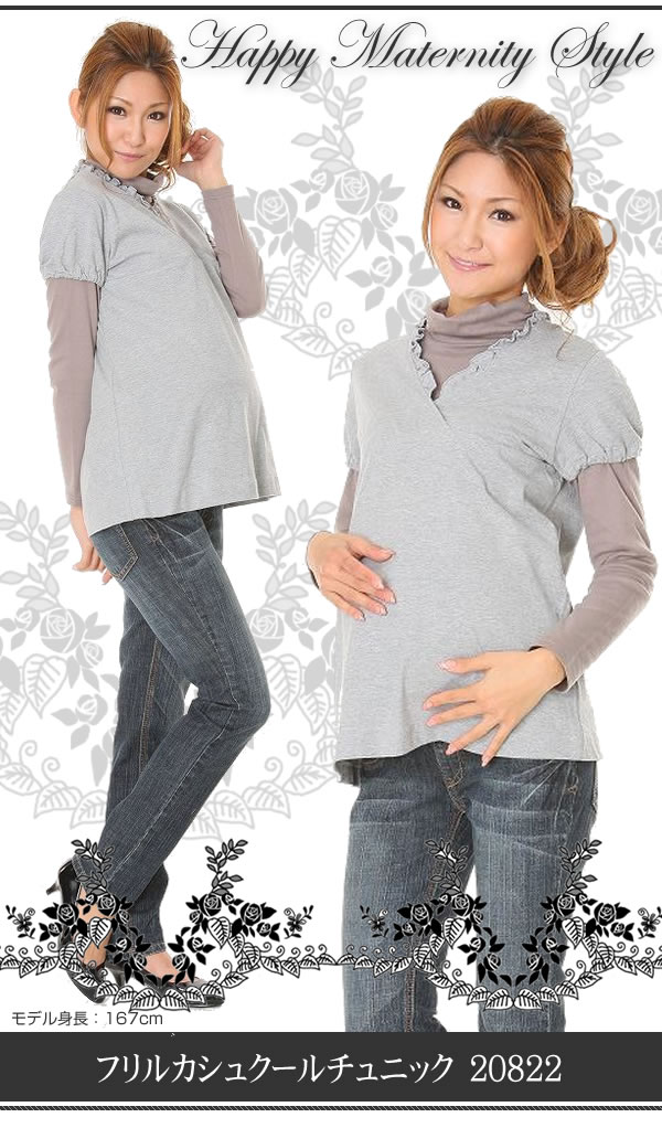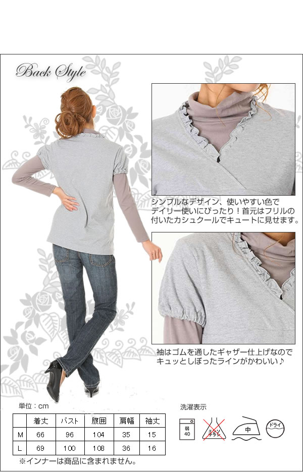 マタニティ期間をハッピーに過ごしたいママに!シンプルなデザインでデイリー使いに便利なカシュクールチュニック。ゴムを通した袖のキュッとしぼったラインがかわいい☆サイズ/M、L 日本製 ※サプライヤー直送品【商品名】フリルカシュクールチュニック 20822 M