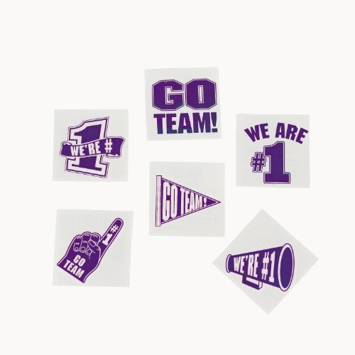 -. Feature : 6 Dozen Purple Go Team Tattoos. / Tattoos Measure 1 1/2 inches. / Easy to Apply & Remove. / Non-Toxic. / Assorted Designs.