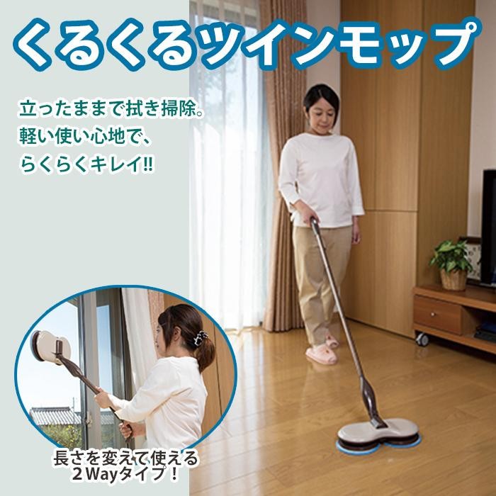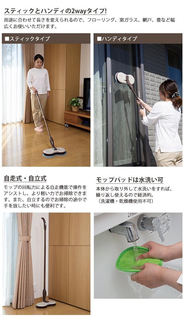 | 電動モップの回転力による自走機能で操作をアシストし、より軽い力でお掃除できます。スティックとハンディの2wayタイプで、長さを変えられるので用途に合わせて使えます。モップパッドは洗って繰り返し使えるので経済的。取り付けもワンタッチで簡単。 |