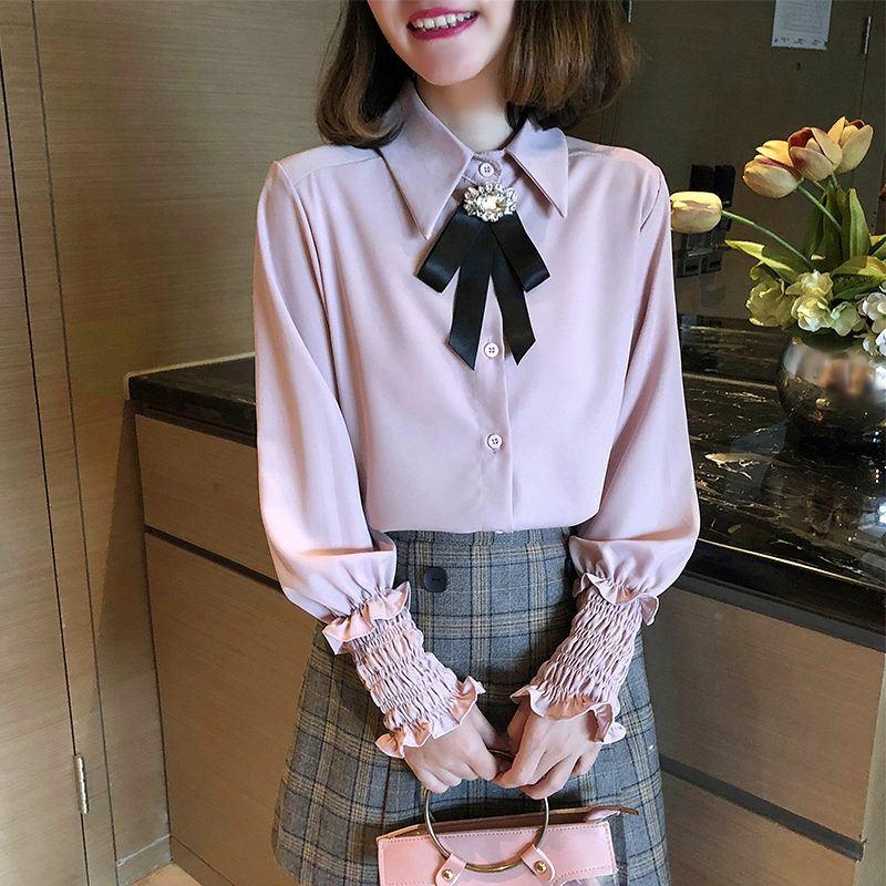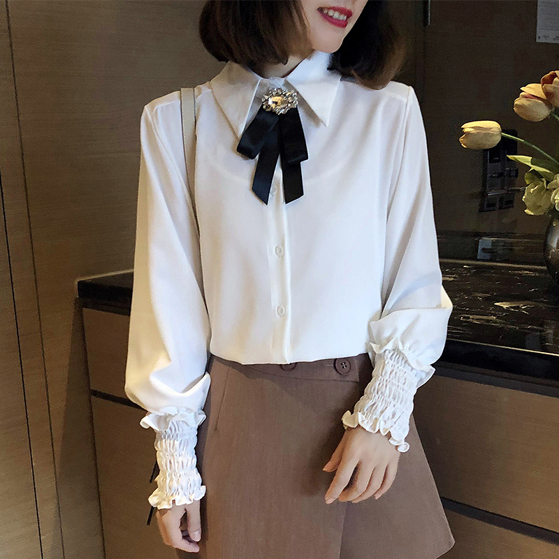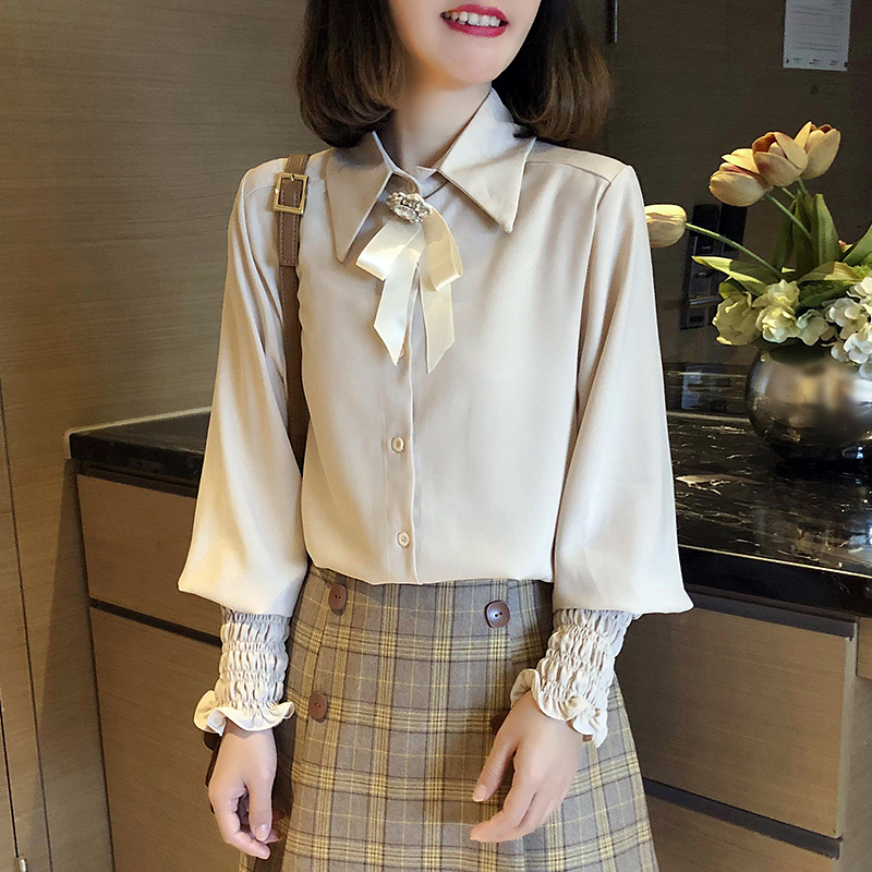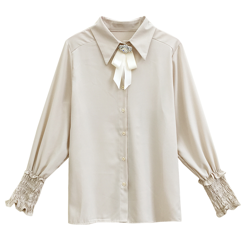 シャツ 長袖 ブラウス リボンタイ付 シンプル ギャザー袖