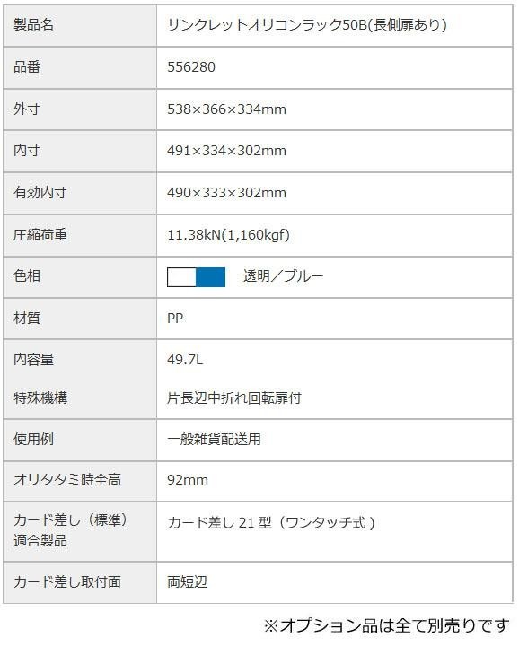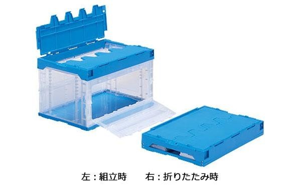 折りたたみコンテナ+一体化されたフタが特徴的なサンクレットオリコンラック♪フタの紛失防止に加え、サンファスナーとの併用により気密性を高める機能性の高いオリコンです。 製造国:日本 ※サプライヤー直送品 ご注文後2~3営業日後の出荷となります【商品名】三甲 サンコー サンクレットオリコンラック(扉付オリコン) 50B(長側扉あり) 透明/ブルー 556280