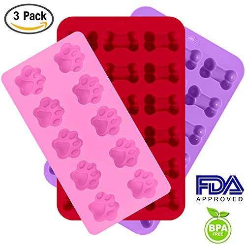 3 Pack Silicone Ice Molds Trays with Puppy Dog Paw and Bone Shape, FineGood Reusable Bakeware Maker for Baking Chocolate Candy, Oven Microwave Freezer Dishwasher Safe - Pink, Red, Purple