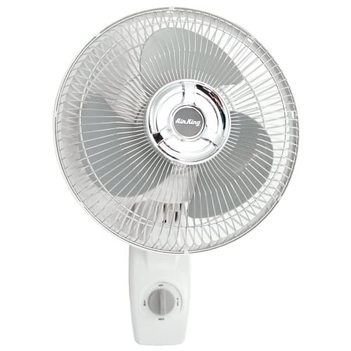 The Air King Commercial Grade Oscillating Wall Mount Fans are ideal for workshops, health clubs, stores, classrooms, offices and other areas where there is limited floor or table space. Model 9012 is an 26 Inch, 3 blade oscillating Wall Mount Fan. The motor is 3 speed, 1/50th HP, 120V, 1 phase, permanently lubricated. Controls are front mounted - rotary and pull cord switch. Power cord is a white, 7 foot, 3 conductor. SPT-2-R type. Metal front grill with impact resistant plastic rear grill and chemical resistant polypropylene blade. Oscillation is 90 degrees and can be locked in non-oscillating position. CFM 930, 780, 620 (High, Medium, Low) RPMs 1,450, 1,300, 1,090 (High, Medium, Low) Amps .4, .3, .27 (High, Medium, Low) Watts 114, 85, 63 (High, Medium, Low). ETL and OSHA compliant, Tested in accordance with AMCA 230.99. Air King offers a full line of industrial grade and commercial grade air circulating fan solutions to meet almost any need you might have. Whether your need is in industrial settings such as manufacturing plants and warehouses or more commercial setting such as offices, schools or hospitals, Air King has the perfect solution for you. Quality, energy efficient and durable Air King products are always a great choice!Feature