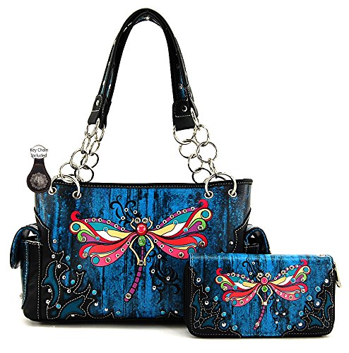 -. Brand : Western LuxeBag -. Color : black -. Department : womens -. Feature : Western Dragonfly handbag and wallet set / Plus Western style cross key chain / Faux leather and top zip closure / More details in the description -. PackageQuantity : 2 -. ProductGroup : Shoes -. ProductTypeName : HANDBAG -. Size : Medium -. Title : Western Style Dragonfly Purse and Wallet Set, Plus Key Chain
