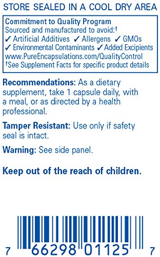 FREE FROM: Pure Encapsulations products are free from wheat, gluten, egg, peanuts, magnesium stearate, hydrogenated fat, artificial sweeteners and colors, and other unnecessary excipients. Any product containing ingredients derived from allergens, such as soy, dairy or shellfish is clearly labeled. * These statements have not been evaluated by the Food and Drug Administration. This product is not intended to diagnose, treat, cure, or prevent any disease.