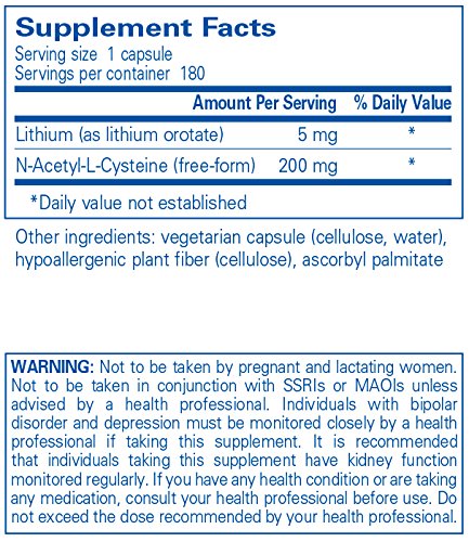 Lithium is an essential micronutrient with some chemical properties similar to calcium and magnesium. It is present in all organs and tissues in the body. Lithium has a long history of clinical use for supporting healthy mood and behavior. Mechanisms for this involve promoting dopamine and serotonin neurotransmitter activity. Lithium also plays a role in gene expression of natural detoxification enzymes in the brain, including glutathione-s-transferase (GST). This offers important neuron antioxidant protection, which may also contribute to healthy spatial memory. Lithium may support healthy brain receptor function and brain signaling cascades to maintain healthy mental function. N-acetyl-cysteine is a precursor to glutathione, the major antioxidant in the brain, and is added to this formula for enhanced protection of brain cell membranes.