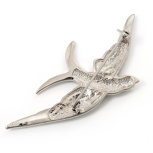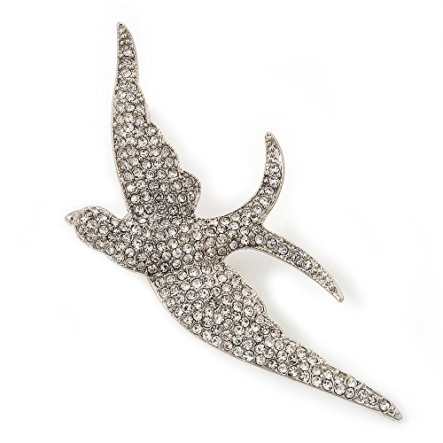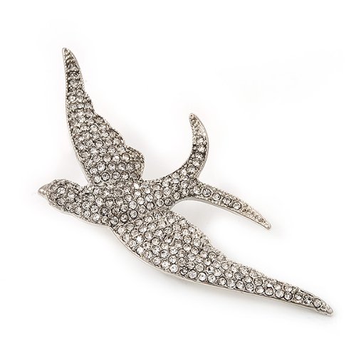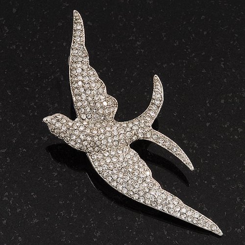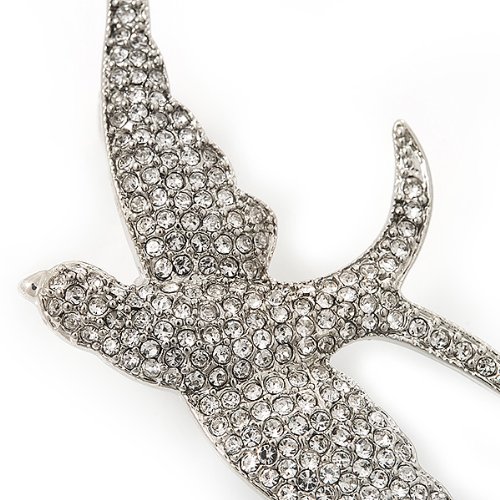 Add a striking touch to a top or shawl with this crystal-set bird brooch. It features a bold swallow design with outstretched wings, all set sparkling with clear Swarovski crystals. The bird measures about 7cm x 3.5cm and secures with a flag pin and revolver clasp.Feature