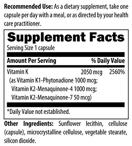 THREE SYNERGISTIC FORMS OF K: Tri-K provides a clinically useful dose of vitamin K in three synergistic forms to be used for maintenance or therapeutic dosing. This vitamin K formula provides 1000 mcg Vitamin K1- the naturally occurring form of vitamin K in vegetables, 1000 mcg Vitamin K2-MK-4 - the highly bioavailable form, and 50 mcg Vitamin K2-MK-7.
