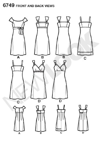 -. Feature : Misses Dresses in size A (6-8-10-12-14-16), New Look Pattern #6749 / Number of looks included: 4 / Designed in UK, Manufactured in USA / Instructions are written in English, Spanish, and French / Sested fabrics: Cotton and Cotton Blends, Damask, Pique, Poplin, Seersucker, Sateen, Silks and Silk Types, Crepe Back Satin, Crepe De Chine, Satin, Shantung, Taffeta, Tissue Lame, Velvet, Linen and Linen Blends
