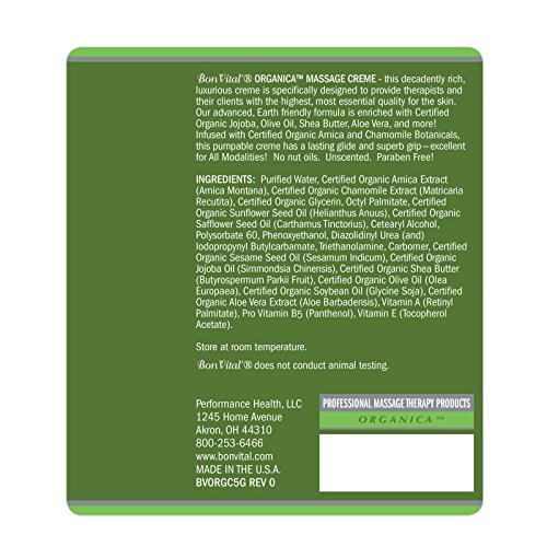 Studio : Bon Vital' Publisher : Bon Vital' Binding : Misc. Product Description Bon Vital, the #1 preferred brand of massage therapists focusing on professional quality products, brings you a line of massage products made with certified organic ingredients that can be used for all massage modalities and techniques. The Bon Vital Organica line of creme, lotion, and gel leverages the benefits of earth-friendly ingredients to provide intense hydration to dry skin. The unscented, water-dispersible formulas are ideal for blending with Bon Vital essential oils to create the ultimate aromatherapy massage experience. 0