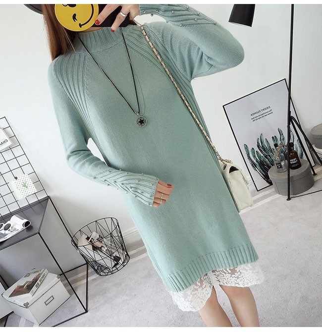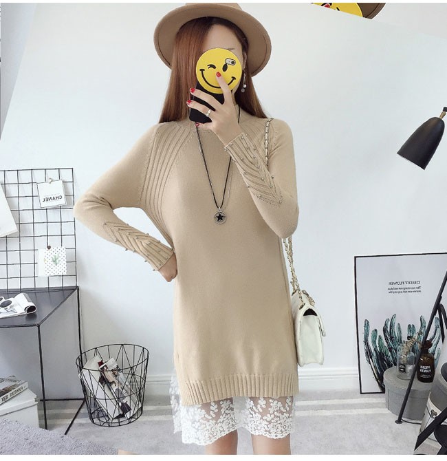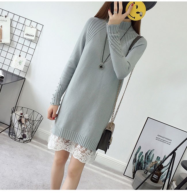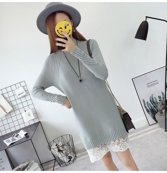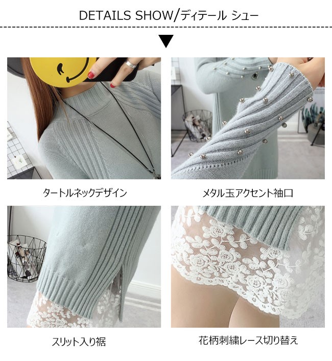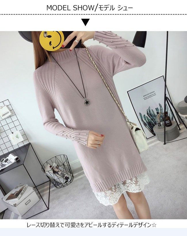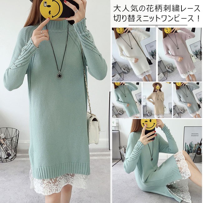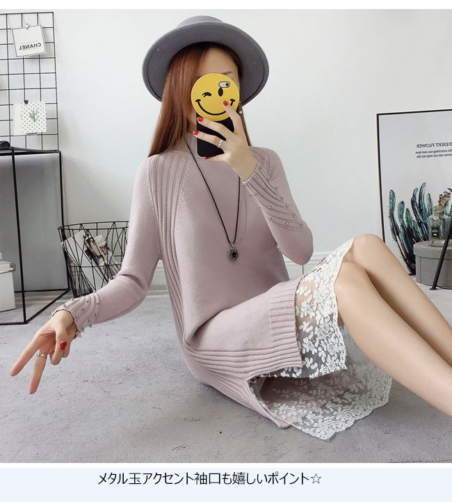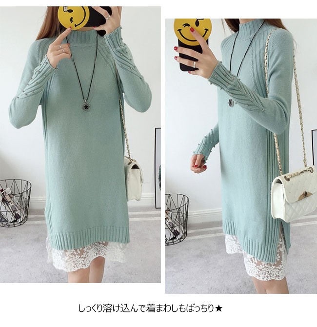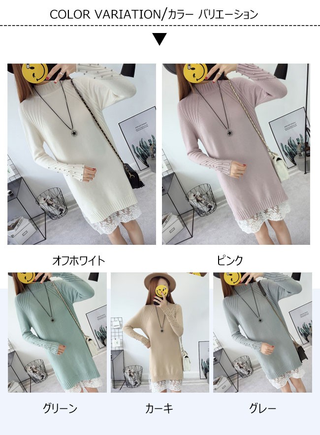 | 商品名 | ニットワンピース レース切り替えワンピース 秋冬ワンピース レース付き フェイクレイヤード レディース インナーワンピース ミディアムワンピース 膝丈 タートルネック 2017秋冬新作 |