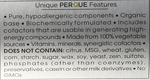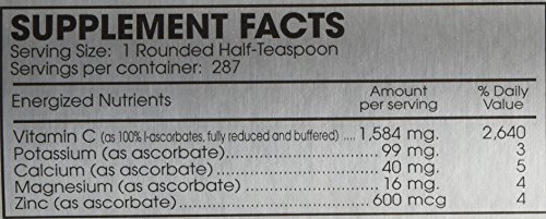 Dietary Supplement Supplement Facts Serving Size: 1 rounded half-teaspoon Servings Per Container: 287 Amount Per Serving: Vitamin C (100% l-ascorbate, fully reduced, corn free) 1584 mg Potassium (as ascorbate) 99 mg Calcium (as ascorbate) 40 mg Magnesium (as ascorbate) 16 mg Zinc (as ascorbate) 600 mcg Full disclosure label (no hidden or inactive ingredients) Directions: Take one (1) rounded half-teaspoon mixed with two (2) to four (4) ounces of liquid or as directed by your health professional. Use only dry transfer spoons to remove powder from bottle. Keep tightly capped and moisture free. Please take a few deep, relaxing breaths while the natural effervescence subsides (~1 min.). May be kept on the counter, in refrigerator or freezer to maintain dryness. KEEP OUT OF REACH OF CHILDREN. Must be stored with cap on tightly in a cool, dry place. Do not use product if the tamper-resist shrink band around the cap or the inner seal beneath the cap appears to have been tampered with or is missing. WARNING: As with all potassium containing food supplements persons with renal insufficiency should consult their health professional before using this product. NOTE: Ability of this product to effervesce can be affected by humidity. Full nutrient potency is retained even as effervescences may be reduced during extended storage. Unique PERQUE Features Pure, hypoallergenic components Fully bioactive Organic base Biochemically formulated Includes cofactors that are usable in generating high-energy compounds Vitamins, minerals, synergistic cofactors DOES NOT CONTAIN: citrus, MSG, wheat, gluten, corn, starch, sugar, wax, soy, yeast, zein, sulfate, phosphates (other than coenzymes), preservatives, casein or other milk derivatives NO GMOs 100% vegetable, energized formula