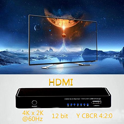 Studio : CLCCON Publisher : CLCCON Binding : Electronics Product Description Product Specification: Model No. VK-A08 Bandwidth Support Up to 10.2Gbps Input Ports 1*HDMI (Female type) Output Ports 4*HDMI (Female type) Output Resolution 480i - 1080p50/60.4K*2K@24/30, 4k2k@60Hz with 12bit Y CBCR 4:2:0, VGA~UXGA 1*USB Port Support Power charge ESD Protection ±8 kV (air-gap discharge) ±4 kV (contact discharge) Audio Support LPCM7.1CH,Dolby TrueHD, and DTS-HD Master Audio; Video resolution Up to 4K*2K/60Hz 3D Format support Up to 1080P/60Hz Dimensions 20*84*132mm Decription: ·High Cost Performance: 1 HDMI source to 4 HDMI displays simultaneously making clutter equipment's cable convert just one input source into four outputs. ·In the limited distance,multimedia video signal can through the HDMI Splitter in high definition to transmit to four displayers. ·According to the different definition,transmission distance is different.The higher the clarity, the shorter the support distance.In contrast,the minimum definition of transmission distance of up to about 15 meters. ·Apply to family, company, school, mall management, monitoring room, conference room, casino, remote monitoring and etc. ·Combine plasma TV and projector to form a home theater. ·Showing the best picture quality. ·Equipped with USB charge, charge your equipment if you like. 0