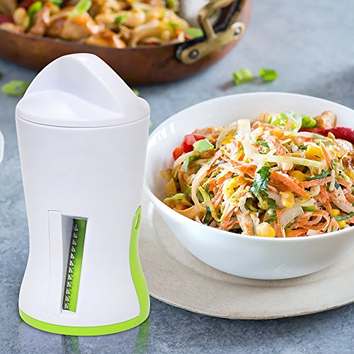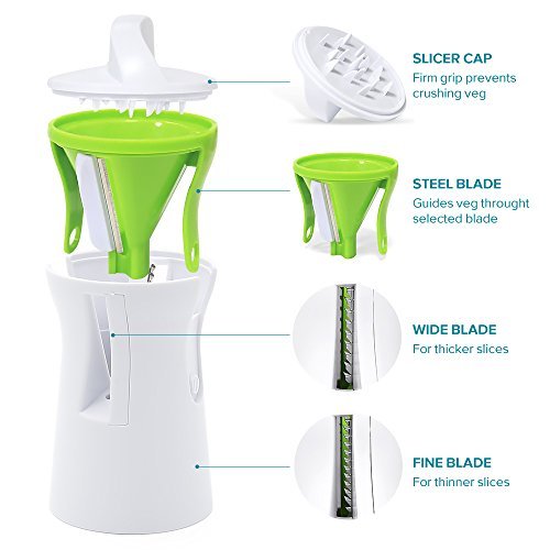 SUPERIOR VALUE : Built from BPA-Free ABS Plastic and Heat-Treated Stainless Steel. Two High Class Japanese Razor Sharp Blades, guaranteed not to rust or loose sharpness qualities in time. Built - In Finger Guard Protection And Safety Cap.CONVENIENT & USER FRIENDLY: Comes assembled and ready to use ! No Annoying Extra Attachment to set up, that take up your space and time. It's Dishwasher safe and Compact, easily stored in the kitchen drawer. Super-easy to use!
