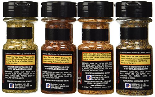 -. Feature : Four Grill Mate Flavors / Montreal Chicken - 2.75oz (77g) / Montreal Steak - 3.4 oz (96g) / Mesquite - 2.5oz (70g) / Smokehouse Maple - 3.5oz (99g)