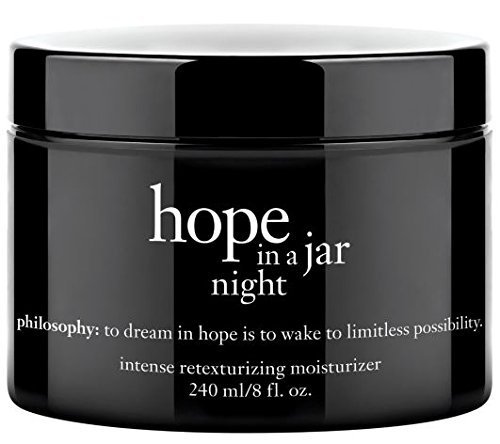 -. Binding : Misc. -. Brand : Philosophy -. EAN : 0604079155809 -. Feature : Leave it to philosophy to help your skin feel smoother, softer, and more replenished. / New in Box / For anyone who wishes to address the look of fine lines. / 8-fl oz hope in a jar night intense moisturizer / Apply after cleansing and treatment in the evening. -. Label : Philosophy -. Manufacturer : Philosophy -. Model : Night Cream -. NumberOfItems : 1 -. PackageQuantity : 1 -. ProductGroup : Beauty -. ProductTypeName : BEAUTY -. Publisher : Philosophy -. Size : all types -. Studio : Philosophy -. Title : Hope in a Jar Night Intense Retexturizing Moisturizer 8 Oz -. UPC : 604079155809