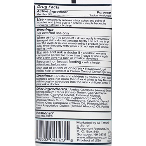 -. Binding : Health and Beauty -. Brand : All Terrain -. EAN : 5056018923638 -. Feature : Pain relieving cream / Great for loosening up before exercise or activity to help prevent injury / Highly effective / Not greasy and doesn't have a strong smell -. IsAdultProduct : 0 -. Label : All Terrain -. Manufacturer : All Terrain -. MPN : All-6954 -. PackageQuantity : 1 -. PartNumber : All-6954 -. ProductGroup : Wireless -. ProductTypeName : HEALTH_PERSONAL_CARE -. Publisher : All Terrain -. Studio : All Terrain -. Title : All Terrain Recovery Rub - 3 oz - 5 Percent Menthol - Pain Relieving Cream