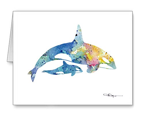-. Feature : "Orcas" artwork by watercolor artist DJ Rogers. / Note card size is 4.25 x 5.5 inches / Matching white envelopes included. / Note cards are blank inside for your personal message. / Suitable for framing.
