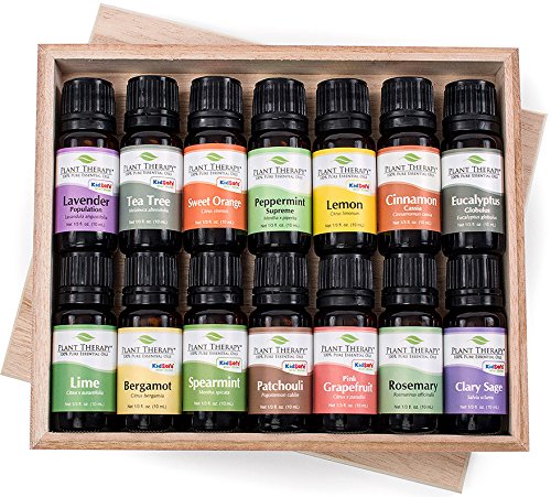 -. Feature : Contains 14 (10 ml each) Pure Essential Oils including: Bergamot, Clary Sage, Cinnamon Cassia, Eucalyptus (Globulus), Grapefruit, Lavender, Lemon, Lime, Patchouli, Peppermint , Rosemary, Spearmint, Orange & Tea Tree / 100% Certified Pure Therapeutic Grade Essential Oil- no fillers, additives, bases or carriers added. / Packaged in dark amber glass bottle with euro style dropper cap. / For your convenience all Plant Therapy Essential Oils have an oil identification sticker on the cap. This is especially beneficial if you use a top load carrying case. / Comes in an attractive gift wooden box.