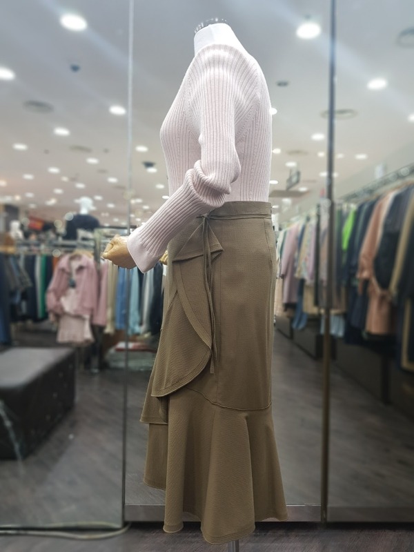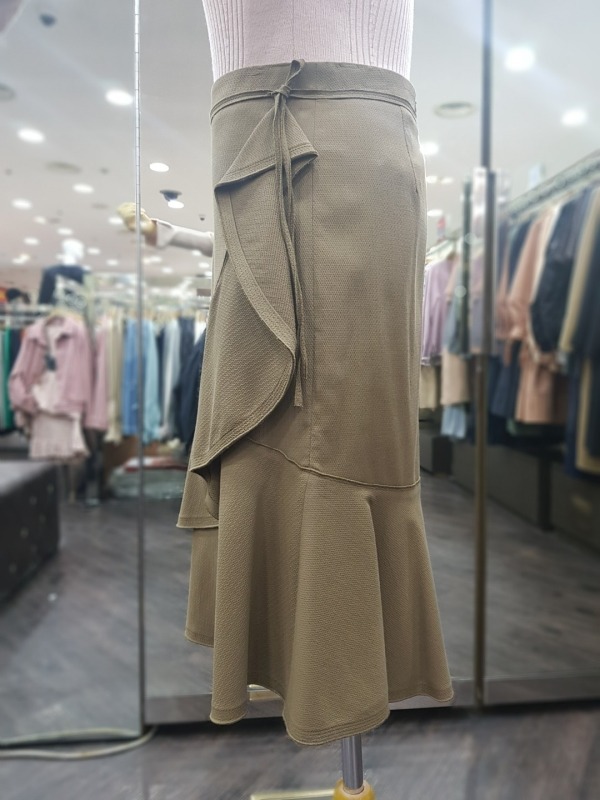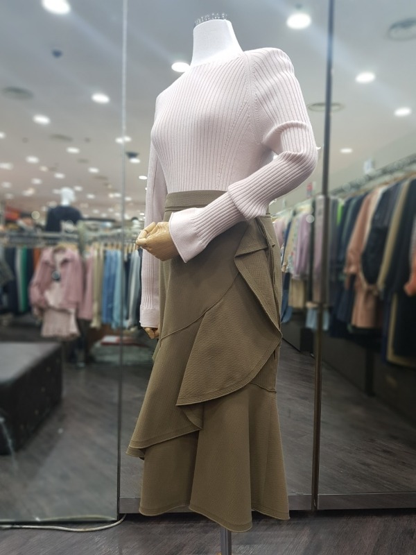 66CM 정도의 롱 스커트로 솔리드한 컬러감 및 정면 상단부터 하단까지 이어지는 플라운스 디테일이 돋보이는 스커트입니다.
