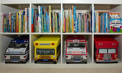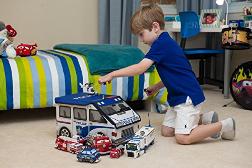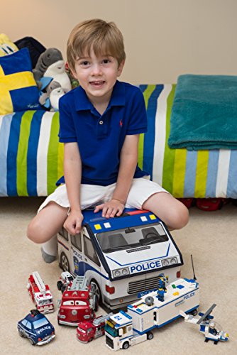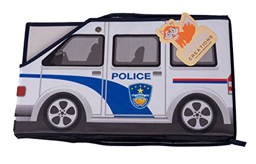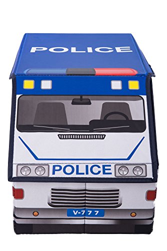 This police car themed storage box features a van-style police car design with tires, police lights, windows, and doors for a fun, police themed way to reduce clutter.