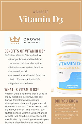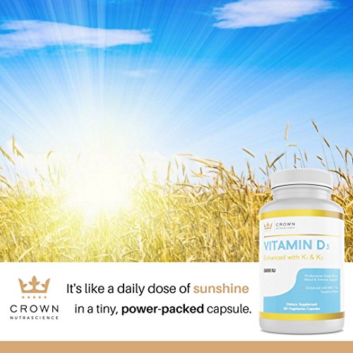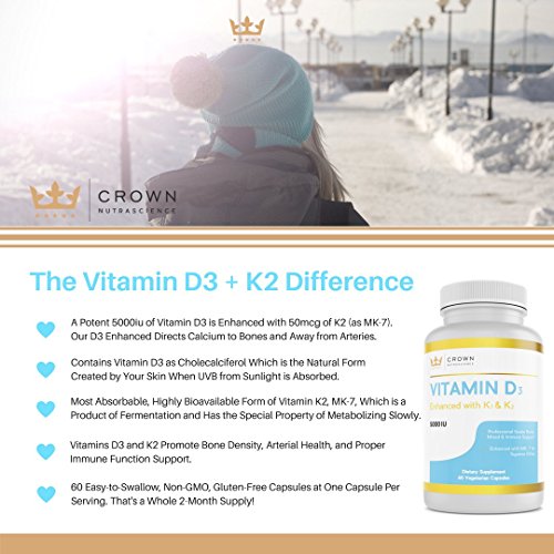 Vitamin D3 Enhanced is formulated using Cholecalciferol, the natural form of D3 that our bodies can easily identify and process more effeciently. We've combined 5000iu of D3 with 50mcg of Vitamin K2 as menaquinone-7 (MK-7). Vitamin K2 enhances the benefits of Vitamin D3 by helping direct calcium away from arteries and joints and towards bones and teeth where it's needed.