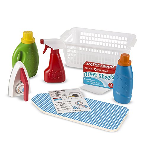 -. Feature : Pretend play wooden iron and ironing board and laundry accessories in a take-along basket / Includes box of three pretend dryer sheets, working spray bottle, detergent bottle and fabric softener bottle with removable lids for measuring / Check off chores on reusable activity card / Encourages fine motor skills, early math and language skills, and helps kids build confidence and self-esteem / Ages 3 years and up