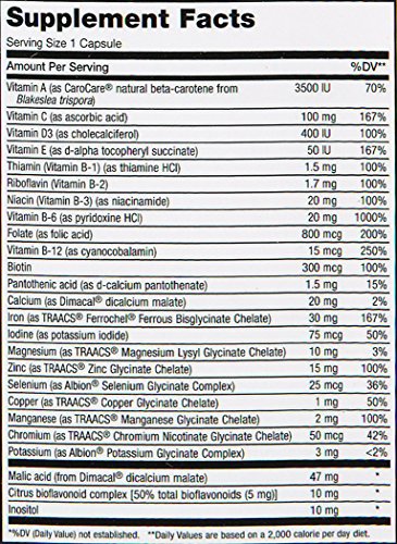 Natural Vitamin E (d-alpha tocopheryl succinate) has been found to be superior in absorption to the synthetic forms (dl type) and its respective acetates. Chromium (as TRAACS chromium nicotinate glycinate chelate) has been found to be more biologically active than other chromium compounds. It is an organic complex that contains niacin as well as cysteine and other nutrients. Biotin is a cofactor for several enzymes, and is essential for carbohydrate metabolism and the synthesis of proteins. Biotin supports the growth and development of healthy nerve tissue and aids in the use of B vitamins and synthesis of ascorbic acid. Pantothenic acid supports a healthy immune system and also aids in the production of hormones. It is essential for proper metabolism of food and is vital during pregnancy. Iron (as Ferrochel) is a patented, nutritionally functional amino acid chelate form of iron. Magnesium (magnesium citrate) a natural source of magnesium, provides the body with additional magnesium as well as a non-irritating stool softener much needed during pregnancy. Inositol provides the nutrient necessary to make cellular membranes.