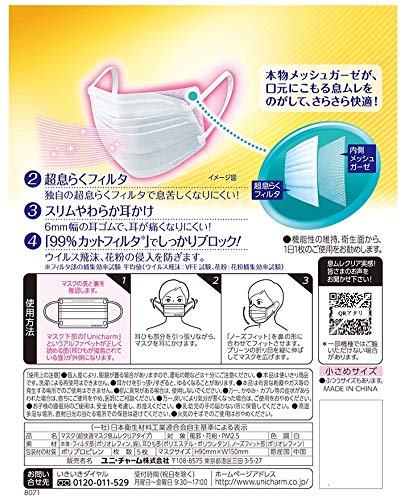 商品名 超快適マスク 息ムレクリアタイプ 小さ め 20枚入 商品詳細 ●息ムレをのがしてさらさら感つづくマスク登場です。●内側メッシュガーゼが口元にこもる息ムレをのがして、つけ心地快適●独自の超息らくフィルタで息苦しくない。しかも、スリムやわらか耳かけで、耳が痛くなりにくく、99%カットフィルタ※でしっかりブロックするから基本機能も安心してお使いいただけます。※フィルタ部の捕集効率試験(ウイルス飛沫:VFE試験) 原材料名 本体・フィルタ部(ポリオレフィン・綿)、耳ひも部(ポリエステル・ポリウレタン)、