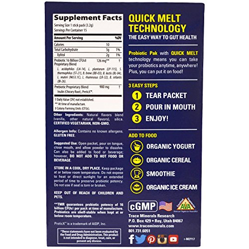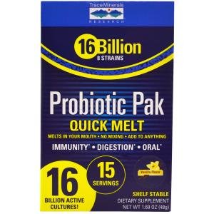 Probiotic Pak Quick Melt Vanilla 15 Serving BoxProduct DescriptionProbiotic Pak with QUICK MELT technology means you can take your probiotics anytime, anywhere Plus, you can put it on food Probiotic Pak is formulated with 16 billion viable organisms from 8 different friendly bacterial strains. It also includes QUICK MELT technology so all you have to do is toss the great-tasting powder in your mouth and away you go. No mixing necessary Want to add a probiotic boost to your yogurt, bowl of fruit, or smoothie? Just toss it in Since intestinal flora often decreases with age, its important to supplement the diet with probiotics.* A balanced gut microbiome supports many functions in the body, including digestion, circulation, immunity, and oral health.*