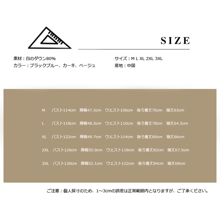 ダウンコート メンズ ロング丈 ダウンジャケット 無地 ライトダウン 大きいサイズ 防寒 防風 高品質 暖かい オフィス 通勤 2018秋冬新作 ダウンジャケット メンズ ロング丈 ダウンコート 無地 アウター商品詳細素材:白のダウン80%カラー:ブラックブルー、カーキ、ベージュサイズ:M L XL 2XL 3XL産地:中国サイズ参照表M バスト114cm 肩幅47.3cm ウエスト106cm 後ろ着丈76cm 袖丈63cm L バスト118cm 肩幅48.5cm ウエスト110cm 後ろ着丈78cm 袖丈64.5cmXL バスト122cm 肩幅49.7cm ウエスト114cm 後ろ着丈80cm 袖丈66cm2XL バスト126cm 肩幅50.9cm ウエスト118cm 後ろ着丈82cm 袖丈67.5cm3XL バスト130cm 肩幅52.1cm ウエスト122cm 後ろ着丈84cm 袖丈69cmご注意:個人採寸のため、1~3cmの誤差は正常範囲内となりますが、ご了承ください。ダウンコート メンズ ロング丈 ダウンジャケット 無地 ライトダウン 大きいサイズ 防寒 防風 高品質 暖かい オフィス 通勤 2018秋冬新作 ダウンジャケット メンズ ロング丈 ダウンコート 無地 アウター