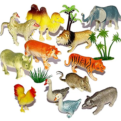 -. Feature : 1 set Mini Jungle and Farm Animals Figures with Trees. / Playset is composed of 15 pieces toy figures, including jungle and farm animals as well as trees. / Great for pretend play, it can help develop your child's creativity and can also broaden their imagination. / Provides a long hour of entertainment for them, keeping them busy while you are preparing food etc. / Made of durable plastic that can withstand rough handling of kids and comes with realistic color, animal measures 3-5 inches.