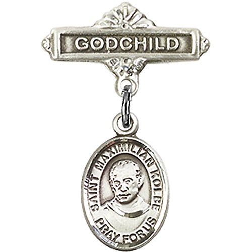 -. Title : Sterling Silver Baby Badge with St. Maximilian Kolbe Charm and Godchild Badge Pin 1 X 5/8 inches