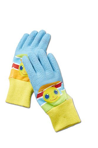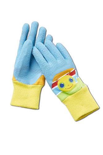 Studio : Melissa Doug Publisher : Melissa Doug Binding : Toy Product Description Get a "grip" on gardening with these fun and friendly child-size gloves! Featuring bright stripes and giddy buggy's smiling face, these gloves, sized to fit ages three to six, are made from sturdy, high-quality, machine-washable material and feature rubber latex coating on the palms to help grip garden tools. These fun and useful gloves keep hands clean while encouraging outdoor exploration and promoting gross and fine motor skills. 0