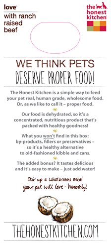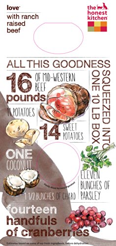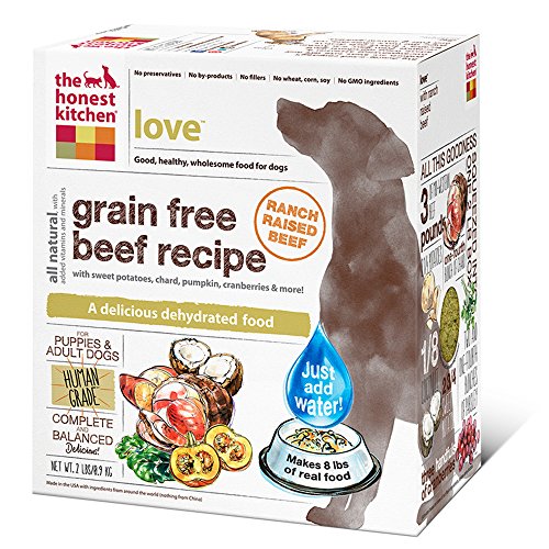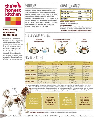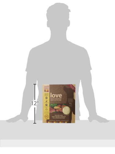Love all natural dog food is AAFCO complete and balanced for all life stages, made with dehydrated hormone-free beef, vegetables, fruits and love. Love is higher in protein and fat than our average recipes. It's perfect for puppies and active adult dogs, especially agility dogs who need a performance dog food. Because Love is a grain-free dog food, it's great for pups who have allergies to grains, gluten, eggs or those who need a low carbohydrate dog food. Just add warm water, wait 5 minutes, and serve for a fresh, wholesome and human grade meal. Love is 100 percent human-grade, and contains no red flag pet food ingredients like corn, soy, rice, beet pulp or wheat. Ingredients are dehydrated hormone-free beef, sweet potatoes, potatoes, organic flaxseed, organic coconut, parsley, dandelion greens, papaya, cranberries, pumpkin, honey, tricalcium phosphate, choline chloride, zinc amino acid chelate, vitamin D3 supplement, vitamin E supplement, potassium iodide, potassium chloride, iron amino acid chelate, copper amino acid chelate. Contains minimum 31 percent protein, minimum 18.5 percent fat, maximum 7 percent fiber, maximum 7.8 percent moisture, 514 calories per cup.Feature