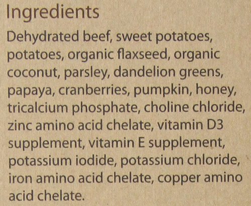 With hormone free beef, sweet potatoes, potatoes, organic flaxseed, organic coconut, parsley, chard and more
