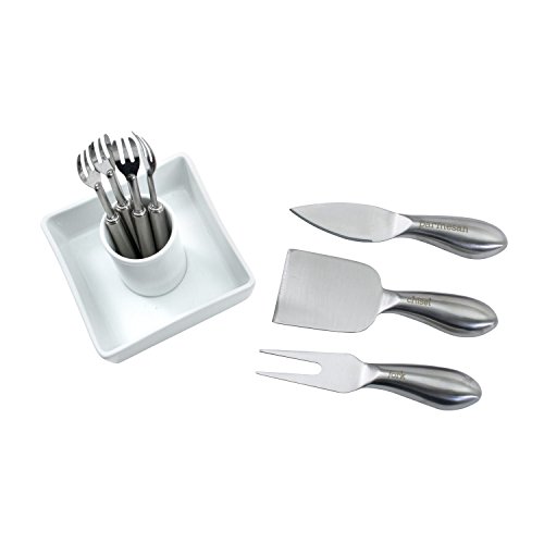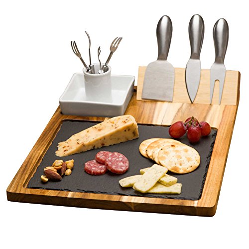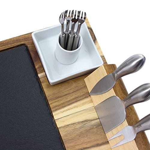 - COMPLETE SERVING SET - 10 Piece Cheeseboard Set comes with everything to impress guests at your next dinner party. Acacia Cheese Board, Slate Platter, Porcelain Olive Dish, (4) Serving Forks, and (3) Premium Stainless Steel Cheese Tools