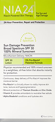 Nia 24 Sun Damage Prevention 100% Mineral Sunscreen is an SPF 30 oil-free, mineral sunscreen treatment. This weightless lotion absorbs instantly leaving no white residue. Physical sunscreens titanium dioxide and zinc oxide offer broad-spectrum protection. Pro-Niacin repairs past damage and promotes skin health.Feature