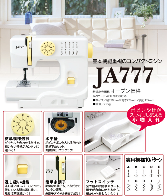 ●付属品:針(1本)、ボビン(3ヶ)、ワイヤー糸通し、フットスイッチ、ACアダプター(6V)、取扱説明書、保証書