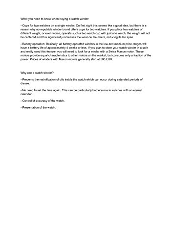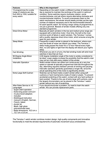 -. Binding : Uhr -. Brand : Temotus -. Color : Schwarz/Silber -. EAN : 4260384979927 -. Feature : 12 PROGRAMME: Der Uhrenbeweger verfügt über 12 Programme für Drehrichtungen im Uhrzeigersinn, gegen den Uhrzeiger und bidirektional. Programme erlauben zwischen 650 und 1550 Umdrehungen pro Tag. Um eine unnötige Belastung der Uhr zu vermeiden wird durch eine Vielzahl an Programmen sichergestellt dass nur die tatsächlich benötigte Anzahl an Umdrehungen in der idealen Drehrichtung verwendet wird. / LANGLEBIGER MOTOR MIT DIREKTANTRIEB: Verfügt über einen qualitativ hochwertigen japanischen Direktantriebsmotor, der eine lange Lebensdauer des Uhrenbewegers garantiert. Fast alle anderen Uhrenbeweger im niedrigen und mittleren Preissegment verwenden dagegen nur Motoren mit Riemenantrieb. Sowohl der Motor als auch das Getriebe wurden vom japanischem Hersteller optimiert für die Verwendung in Uhrenbewegern. Der Motor ist extrem leise. / INTELLIGENTER SCHLAFMODUS TIMER: Der Uhrenbeweger pausiert jede Nacht für 12 Stunden. Gleichzeitig verfügt der Uhrenbeweger bewusst über keinerlei LEDs die den Schlaf stören könnten. / EXPRESS AUFZIEHEN DER UHR IN 60 MINUTEN: Wenn Sie es eilig haben kann fast jede Uhr in weniger als einer Stunde im "Fast Winding" Modus aufgezogen werden (Geschwindigkeit von 6150 Umdrehungen pro Tag). / OPTIMALER 90 GRAD AUFSTELLWINKEL: Ein 90 Grad Aufstellwinkel des Motors ist ideal. Bei niedrigeren Winkeln erhöht sich die Möglichkeit, daß der Rotor der Armbanduhr mit jeder Rotation des Winders nicht vollständig aufgezogen wird. -. Label : Temotus -. Manufacturer : Temotus -. Model : TM-q -. MPN : TM-1 -. PartNumber : TM-1 -. ProductGroup : Watch -. ProductTypeName : WATCH -. Publisher : Temotus -. Studio : Temotus -. Title : Temotus Uhrenbeweger für automatische Uhren