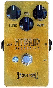 Product Description The Skreddy PedalsTM Hybrid Overdrive cleans up extremely well with the guitar volume and has an authentic rock voice like a huge early 70's British tube amplifier. This circuit has less gain and more headroom compared to the Skreddy Major Overdrive. Sounds nearly identical to the Hybrid Fuzz Driver (same oldschool-silicon-germanium fuzz stage) but has a stronger tone control for less high-end fizz and better ability to darken at min, an ever-so-slightly stronger low-midrange, and it stays punchy and cutting even at max gain, never gets mushy. Has a singing, vintage voice with plenty of gain just shy of fuzz and gets along with all kinds of pickups. The tone is focused but balanced. The attack is amp-like and cutting with dynamic overdrive that responds intuitively to guitar volume, pickup selection, and picking technique. Very reactive to the touch; notes are sweet, chords have excellent string separation, and there is plenty of crunch and growl while holding together and not going fuzzy and compressed. 0