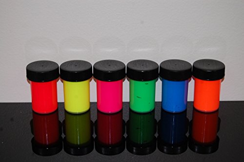 6 bright neon colors in 3/4oz per bottle. Blue, green, yellow, orange, pink, and red. Our colors have been thoroughly tested and glow blistering bright in blacklighted conditions.