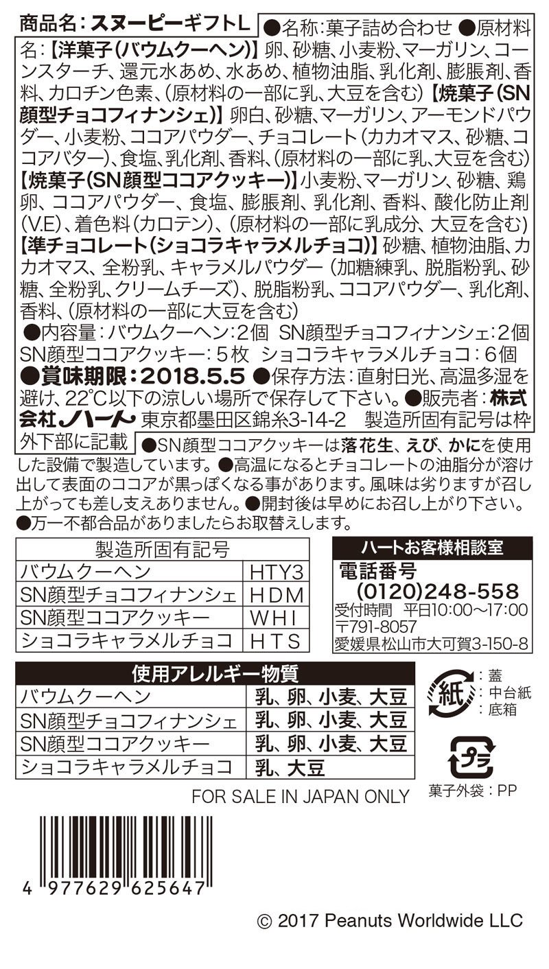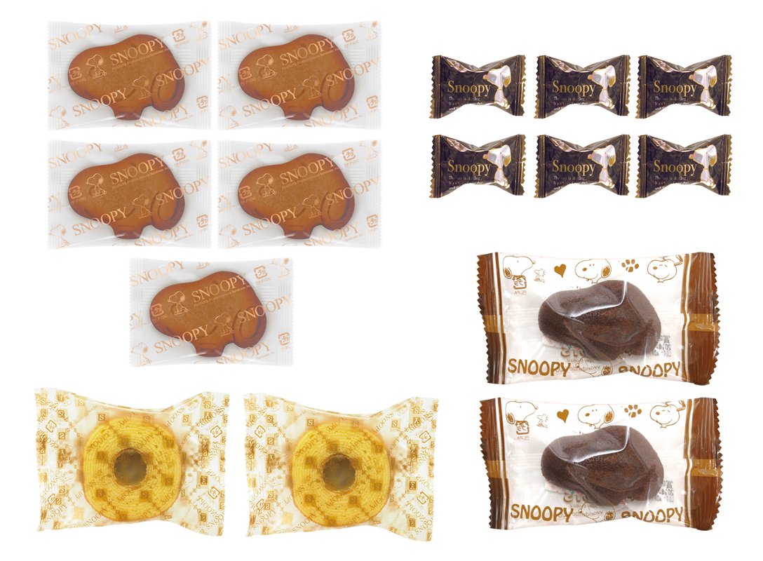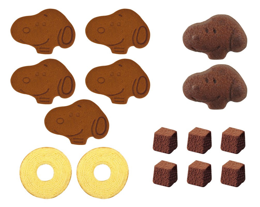 スヌーピーは1950年に「ピーナッツ」で掲載されて以来、長年愛されているキャラクターです。最近ではスヌーピーショップやカフェも人気です。そんな可愛らしいスヌーピーデザインのパッケージにバウムクーヘン、ソフトチョコレート、スヌーピー顔型クッキー、スヌーピー顔型フィナンシェの4種類の菓子を詰め合わせた商品です。