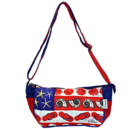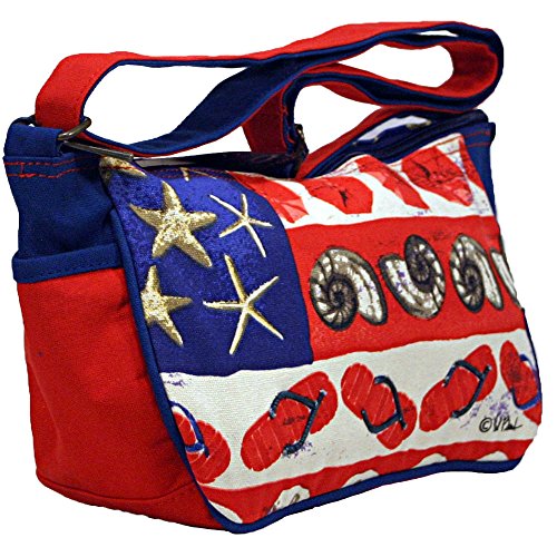 - Made from cotton canvas it features a nautical take on the American flag. The print is on both sides of the bag with red and blue trim and blue piping.