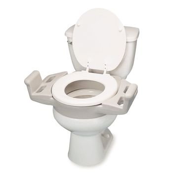 Studio : Sammons Preston Publisher : Sammons Preston Binding : Health and Beauty Product Description One compact device adds 4" to toilet seat height and includes push handles to aid lowering to and rising from the seat! Designed to fit standard toilet seats. Width between arms is 20-1/4". Lateral gripping slots aid those with postural insecurity. Arms 3-1/2"H. Hole 8"W x 10"D. 24-3/16"W x 15-1/2"D. Hardware kit included. Sturdy molded design has 400-lb. weight capacity. Latex free. 0